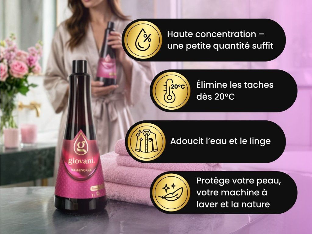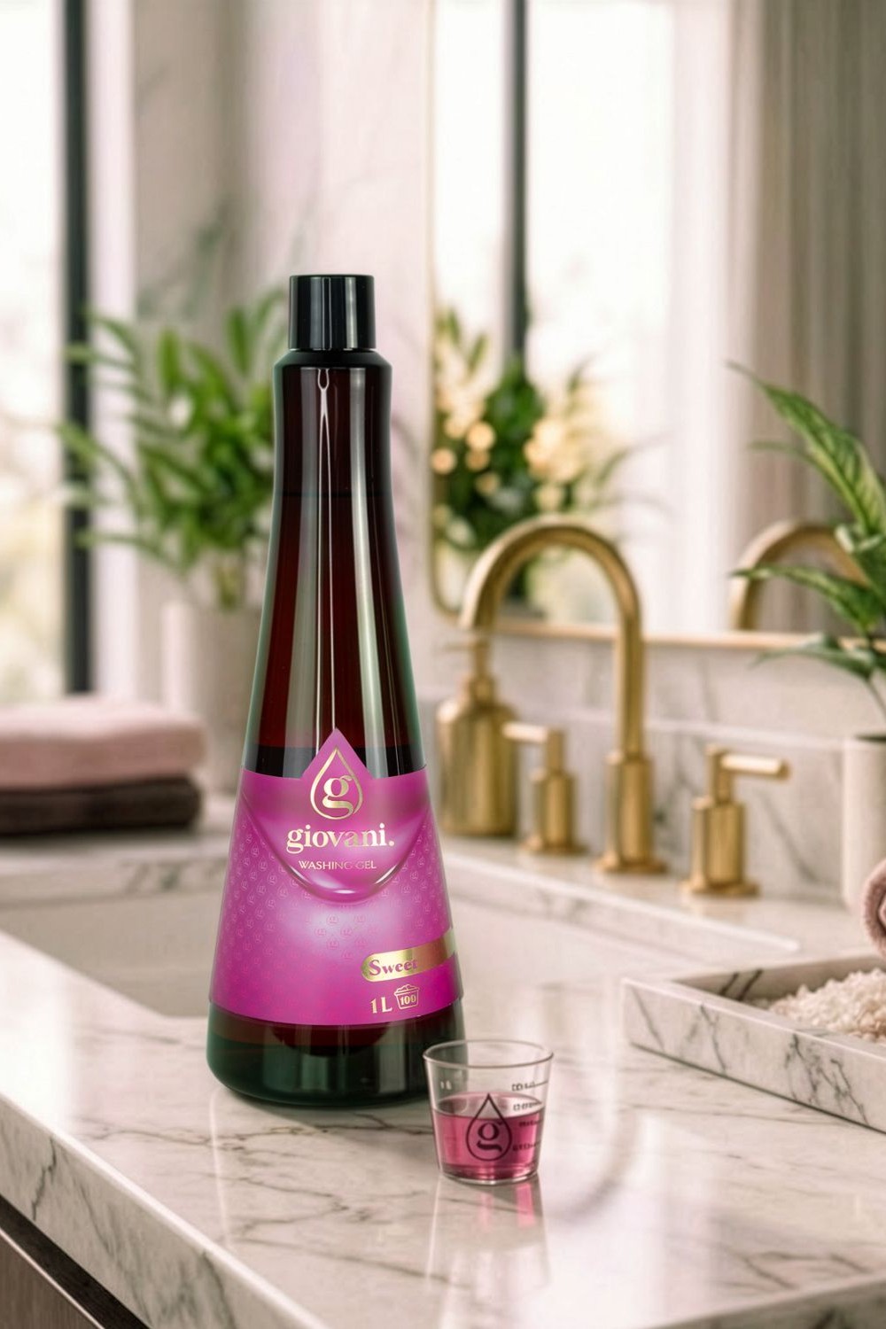 La lessive ne doit plus être une simple corvée. Avec le gel de lessive Giovani® SWEET, le lavage devient une expérience sensorielle rafraîchissante. Ce gel concentré nettoie parfaitement le linge même à faible dosage et à basse température.
