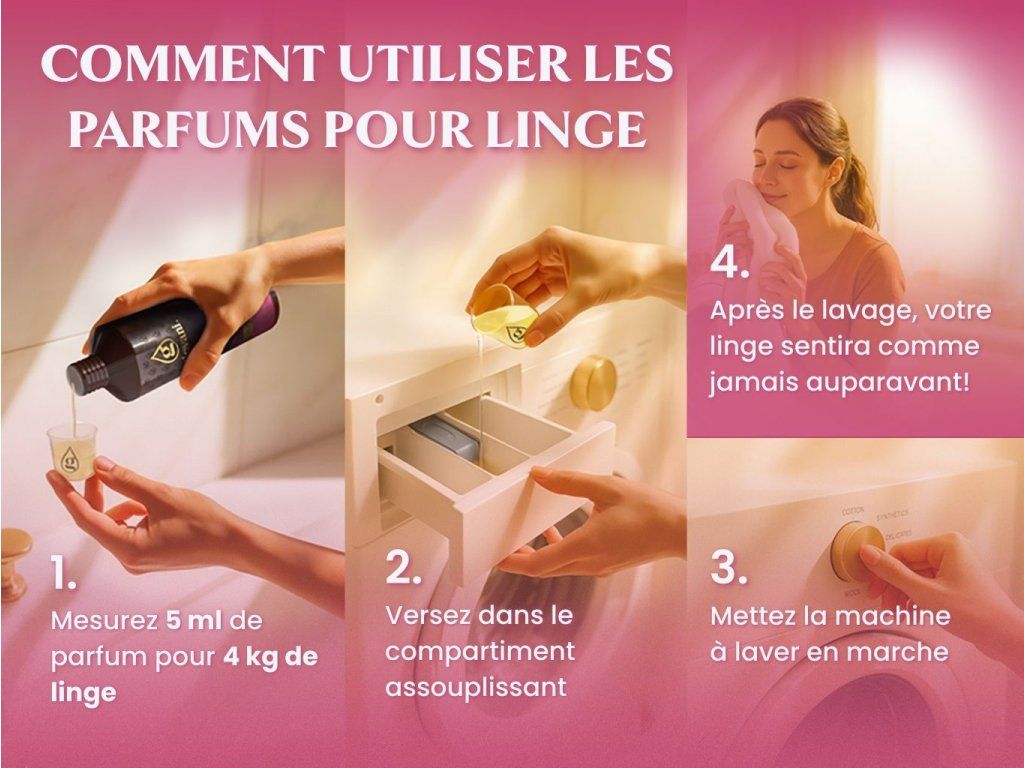 Utilisation: Verser 5 ml de concentré dans le bac de l'assouplissant. Cette quantité correspond à une dose pour 4 kg de linge. Le concentré n'est pas dilué. Pour le dosage, vous pouvez utiliser le bouchon du parfum Giovani®, correspondant à 3 ml. Nous recommandons d’appliquer 2 doses du bouchon. Pour un dosage plus confortable, vous pouvez acheter une pipette graduée avec notre logo ou une pompe doseuse alternative. Il suffit donc d'utiliser une petite quantité et votre linge sera parfaitement parfumé!