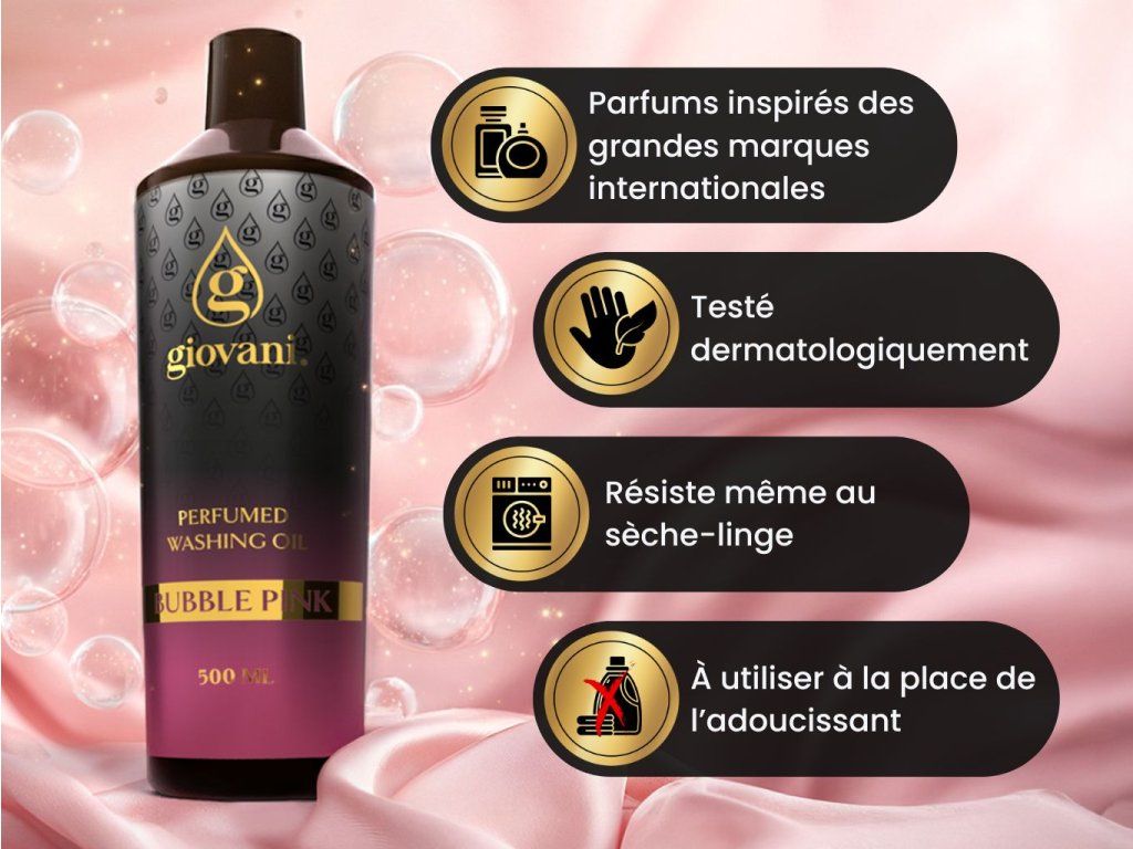 Giovani® est une marque exclusive et luxueuse de parfums de lessive. Nous avons pris grand soin de garantir leur haute qualité. Lors du développement de ces parfums, il était important pour nous d'obtenir une forte intensité et une longue durabilité, afin de pouvoir parler de Giovani® comme étant la meilleure marque de parfums de lessive sur le marché. Leur grand avantage est qu'ils n'encrassent pas la machine à laver, ne laissent pas de résidus gras et ne tachent pas le linge. Grâce à certaines substances contenues dans nos produits, nos huiles prennent également soin de la couleur de votre linge. Elles sont végétaliennes, exemptes de dioxane, SVHC, parabènes, tensides, PBT/vPvB, métaux lourds, résidus polluants, microplastiques et nanoplastiques. Le design luxueux de la marque Giovani® ajoute à son caractère unique. Nous sommes par ailleurs fiers de notre livraison dans les 24 heures et de notre service clientèle rapide. |
