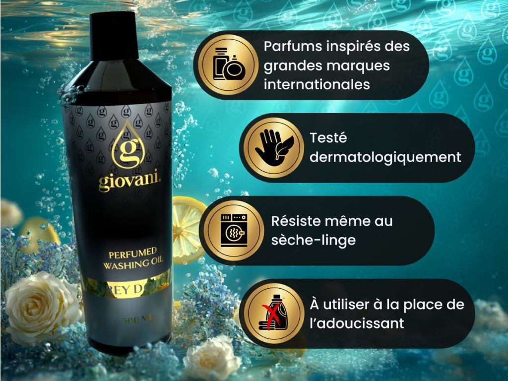 Giovani® est une marque exclusive et luxueuse de parfums de lessive. Nous avons pris grand soin de garantir leur haute qualité. Lors du développement de ces parfums, il était important pour nous d'obtenir une forte intensité et une longue durabilité, afin de pouvoir parler de Giovani® comme étant la meilleure marque de parfums de lessive sur le marché. Leur grand avantage est qu'ils n'encrassent pas la machine à laver, ne laissent pas de résidus gras et ne tachent pas le linge. Grâce à certaines substances contenues dans nos produits, nos huiles prennent également soin de la couleur de votre linge. Elles sont végétaliennes, exemptes de dioxane, SVHC, parabènes, tensides, PBT/vPvB, métaux lourds, résidus polluants, microplastiques et nanoplastiques. Le design luxueux de la marque Giovani® ajoute à son caractère unique. Nous sommes par ailleurs fiers de notre livraison dans les 24 heures et de notre service clientèle rapide. |