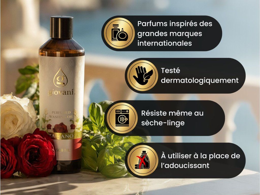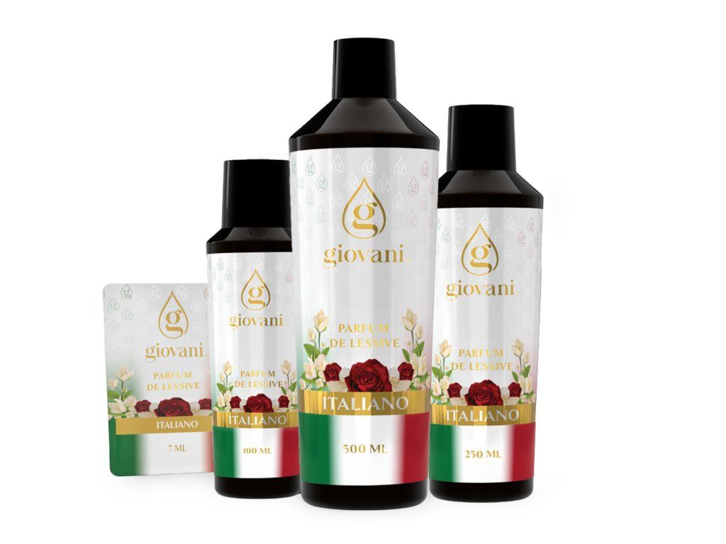 Giovani® est une marque exclusive et luxueuse de parfums de lessive. Nous avons pris grand soin de garantir leur haute qualité. Lors du développement de ces parfums, il était important pour nous d'obtenir une forte intensité et une longue durabilité, afin de pouvoir parler de Giovani® comme étant la meilleure marque de parfums de lessive sur le marché. Leur grand avantage est qu'ils n'encrassent pas la machine à laver, ne laissent pas de résidus gras et ne tachent pas le linge. Grâce à certaines substances contenues dans nos produits, nos huiles prennent également soin de la couleur de votre linge. Elles sont végétaliennes, exemptes de dioxane, SVHC, parabènes, tensides, PBT/vPvB, métaux lourds, résidus polluants, microplastiques et nanoplastiques. Le design luxueux de la marque Giovani® ajoute à son caractère unique. Nous sommes par ailleurs fiers de notre livraison dans les 24 heures et de notre service clientèle rapide. |