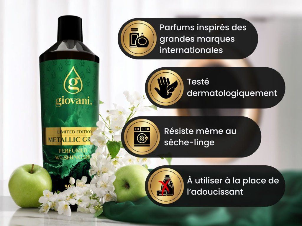 L'édition limitée de Giovani® Metallic Green a été créée dans le but d'offrir une expérience olfactive unique et la plus intense possible. Après le lavage, votre linge et votre maison sentiront bon pendant longtemps l'arôme d'un parfum doux et frais.