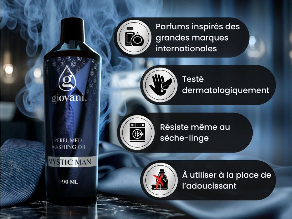 Giovani® est une marque exclusive et luxueuse de parfums de lessive. Nous avons pris grand soin de garantir leur haute qualité. Lors du développement de ces parfums, il était important pour nous d'obtenir une forte intensité et une longue durabilité, afin de pouvoir parler de Giovani® comme étant la meilleure marque de parfums de lessive sur le marché. Leur grand avantage est qu'ils n'encrassent pas la machine à laver, ne laissent pas de résidus gras et ne tachent pas le linge. Grâce à certaines substances contenues dans nos produits, nos huiles prennent également soin de la couleur de votre linge. Elles sont végétaliennes, exemptes de dioxane, SVHC, parabènes, tensides, PBT/vPvB, métaux lourds, résidus polluants, microplastiques et nanoplastiques. Le design luxueux de la marque Giovani® ajoute à son caractère unique. Nous sommes par ailleurs fiers de notre livraison dans les 24 heures et de notre service clientèle rapide. |