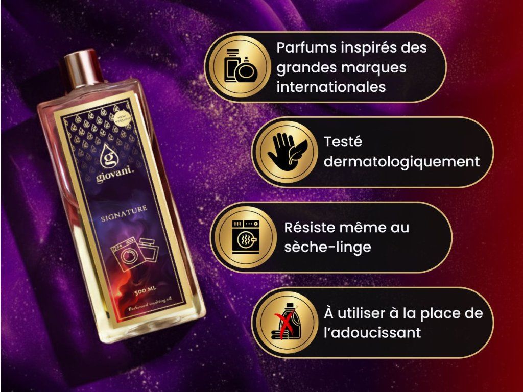 Giovani® est une marque exclusive et luxueuse de parfums de lessive. Nous avons pris grand soin de garantir leur haute qualité. Lors du développement de ces parfums, il était important pour nous d'obtenir une forte intensité et une longue durabilité, afin de pouvoir parler de Giovani® comme étant la meilleure marque de parfums de lessive sur le marché. Leur grand avantage est qu'ils n'encrassent pas la machine à laver, ne laissent pas de résidus gras et ne tachent pas le linge. Grâce à certaines substances contenues dans nos produits, nos huiles prennent également soin de la couleur de votre linge. Elles sont végétaliennes, exemptes de dioxane, SVHC, parabènes, tensides, PBT/vPvB, métaux lourds, résidus polluants, microplastiques et nanoplastiques. Le design luxueux de la marque Giovani® ajoute à son caractère unique. Nous sommes par ailleurs fiers de notre livraison dans les 24 heures et de notre service clientèle rapide. |